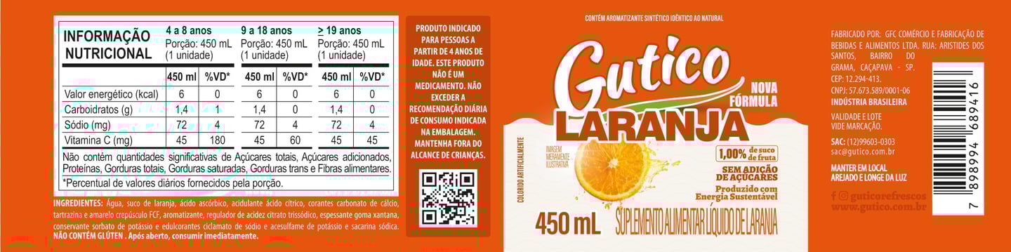 Suplemento alimentar líquido, rico em vitamina C, sem adição de açúcares.